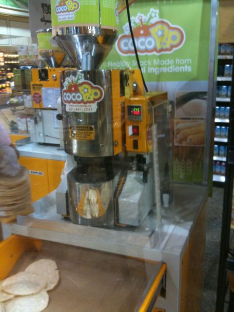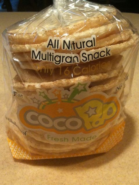 CocoPop, not coco pops – the australian cereal that no longer exists. How to explain, they are flat circular wafer like snacks, 16 calories, made in this strange contraption below – from Wheat, rice, corn and sea salt. No oil, no nothing.. Tastes like a mix between a rice cake and an ice cream cone, by themselves, just a nice plain snack, but throw some peanut butter on top – and you have a very beautiful thing. They are lightly toasted and deliciously simple. Available at Wegmans.